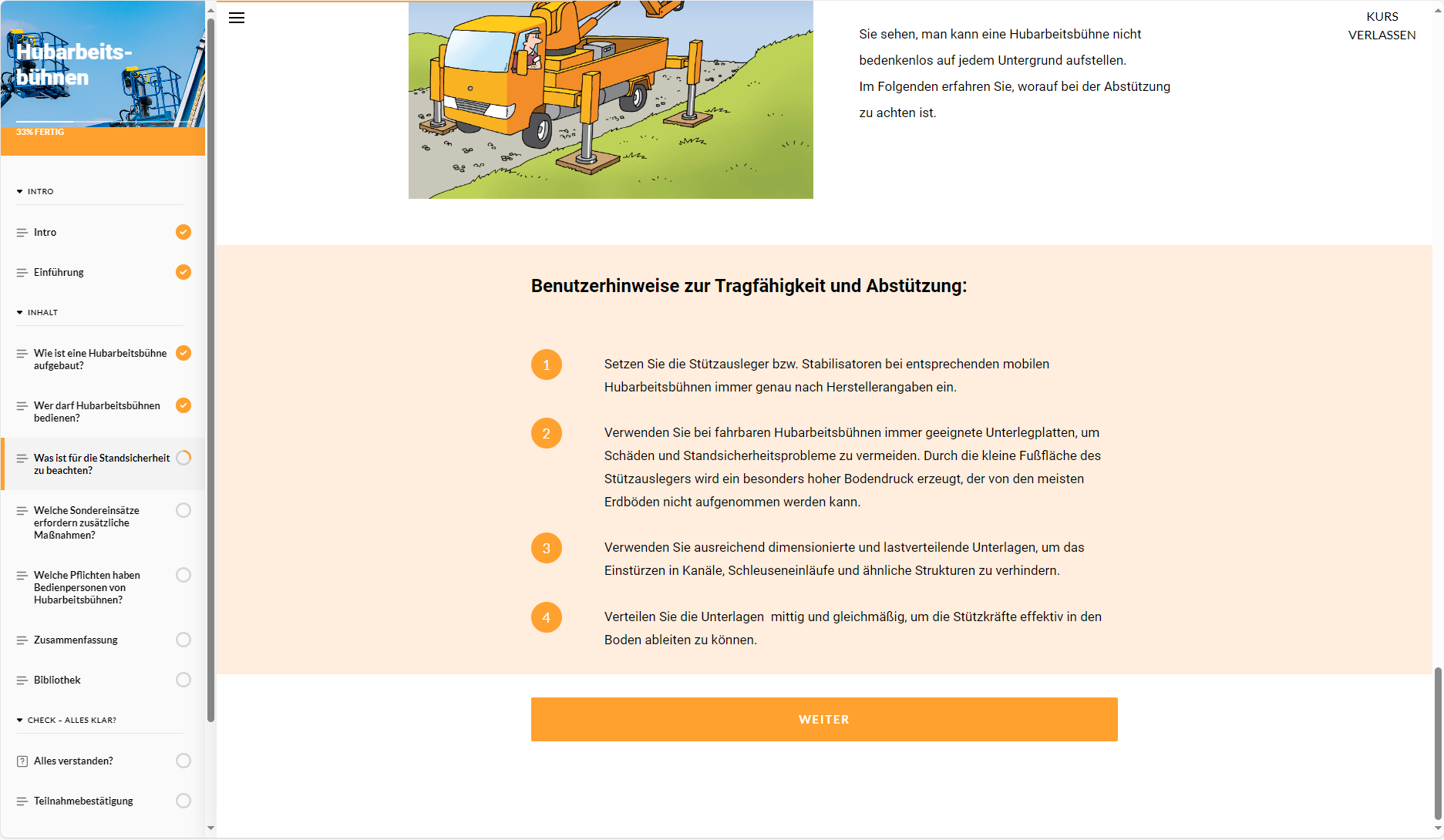 Die E-Learning-Lösungen von WEKA haben einen interaktive Charakter. So werden die Lernenden aktiviert und die Kurse erzielen eine hohe Akzeptanz bei den Mitarbeitenden. Vertonte und verständliche Texte, animierte Grafiken und aktives Mitwirken unterstützen dabei die Aufnahme der zu vermittelnden Inhalte.